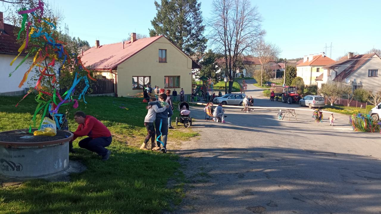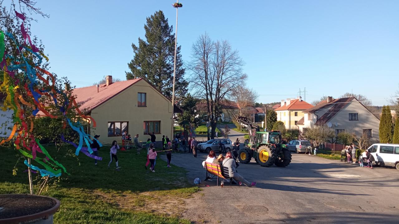 Stavění máje na návsi, pálení čarodějnic a prvomájový průvod v roce 2023.