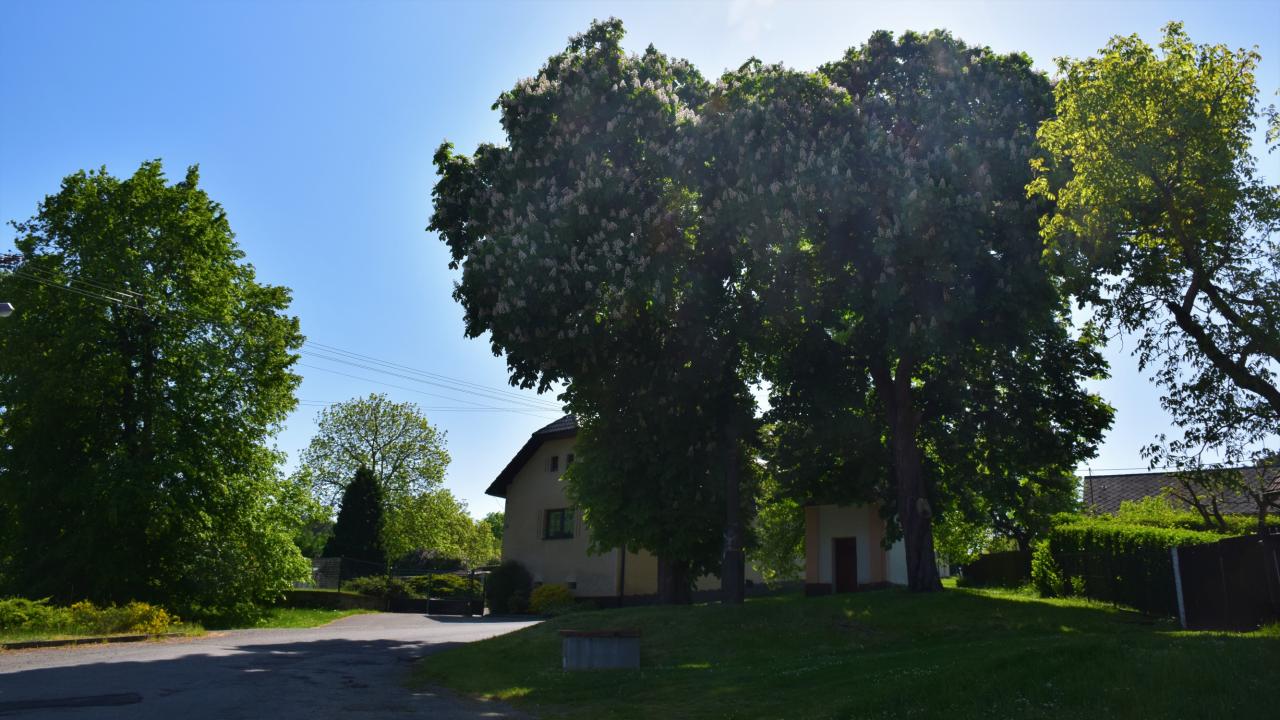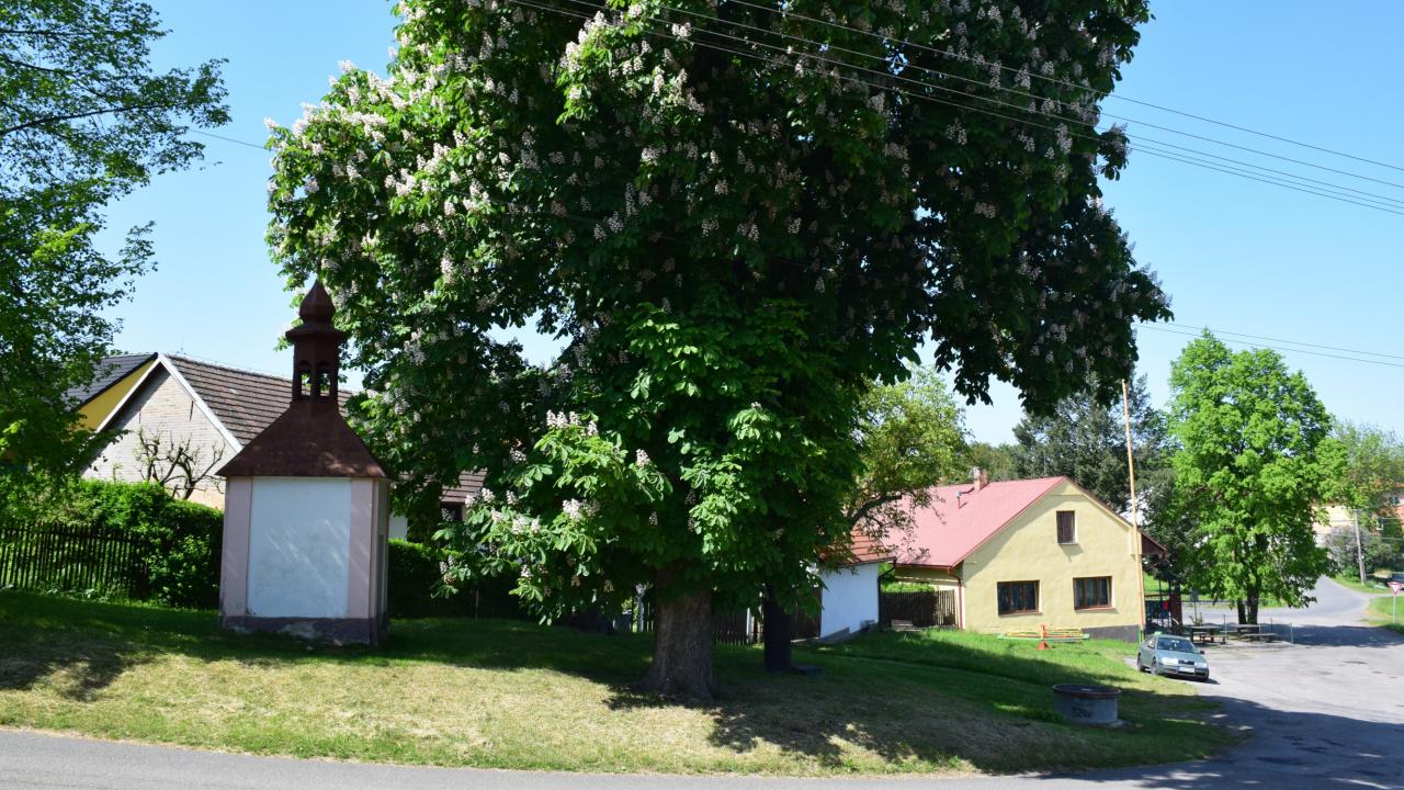 Kaplička na návsi obklopená jírovci